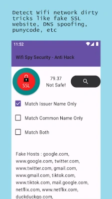Wifi Spy Security - Anti Hack tries to determine phishing some sites if the SSL those sites are same with your own network. Because some people (wifi security hackers) are trying phishing with SSL fake websites on your wifi when it's hacked.
